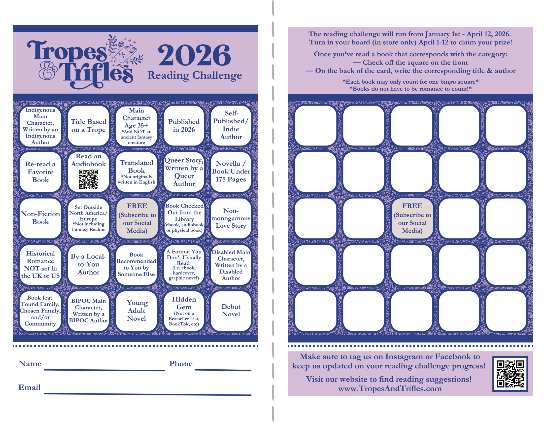 Despite not living in Minnesota, one of my favorite indie bookstores is Tropes & Trifles in the Twin Cities. They specialize in romance novels, but they’re also an amazing community hub and partner for other small businesses in the area. To celebrate Tropes & Trifles’ second anniversary, the shop staff created a bingo reading challenge. I love this sort of challenge because it encourages me to diversify my reading and has given me direction as I start the year with the longest TBR known to man (I am not kidding). If you like a bingo challenge, and especially if you live in Minnesota, check out the board here. You have until April 12th to get a bingo, and you don’t actually have to read romance to do it!