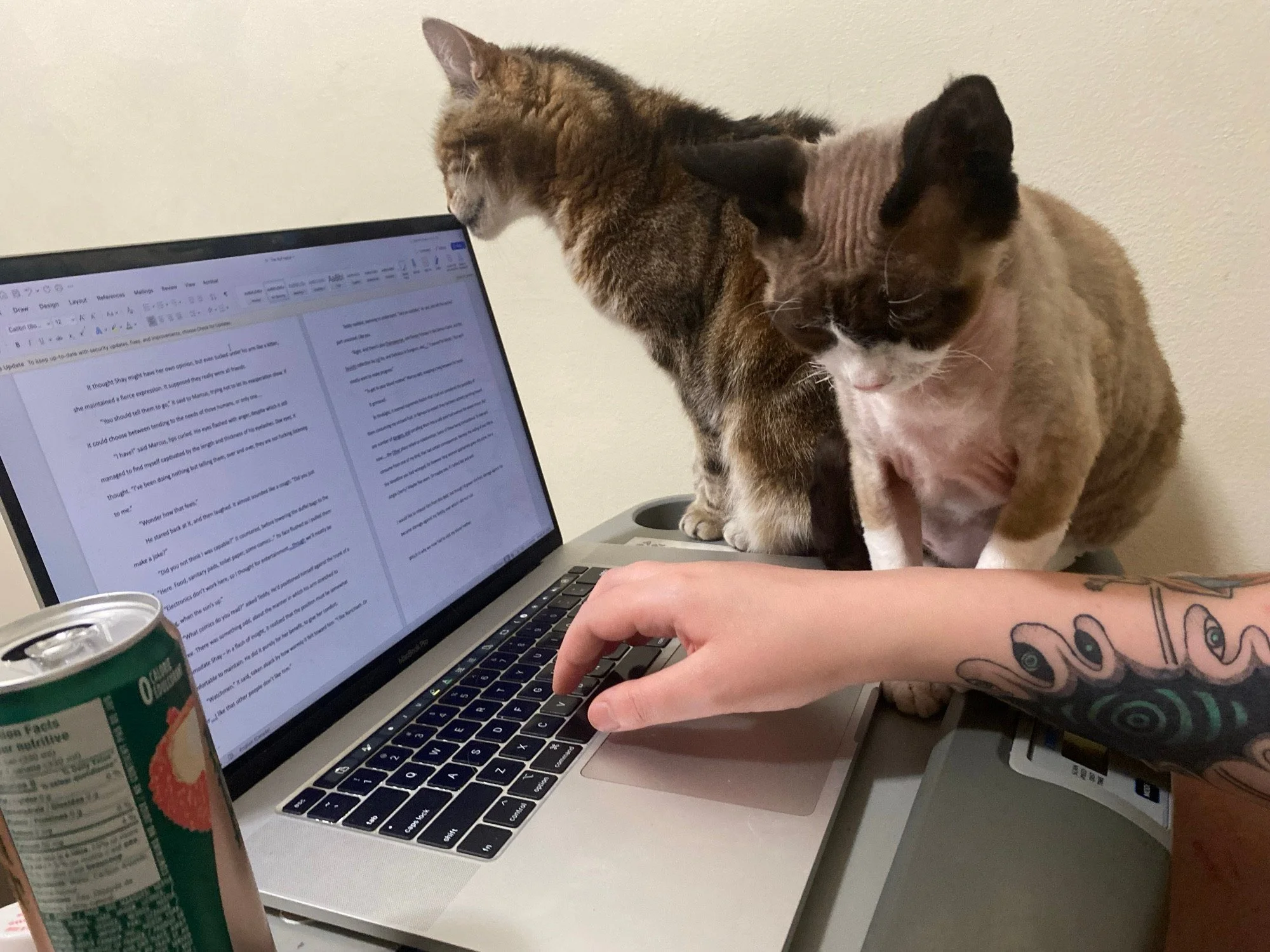 Greer Stothers (they/them) is known more for their nature inspired illustrations, commissioned for clients like The Magus Archives and Canadian Geographic. Apparently, Sir Cameron Needs to Die is Stother’s debut novel, but they previously published a collection of narrative poems, My Kitten Got Sick. You can follow their beautiful children, Pangur, Grim, and Belphie, on Instagram and Greer on Tumblr and Bluesky.